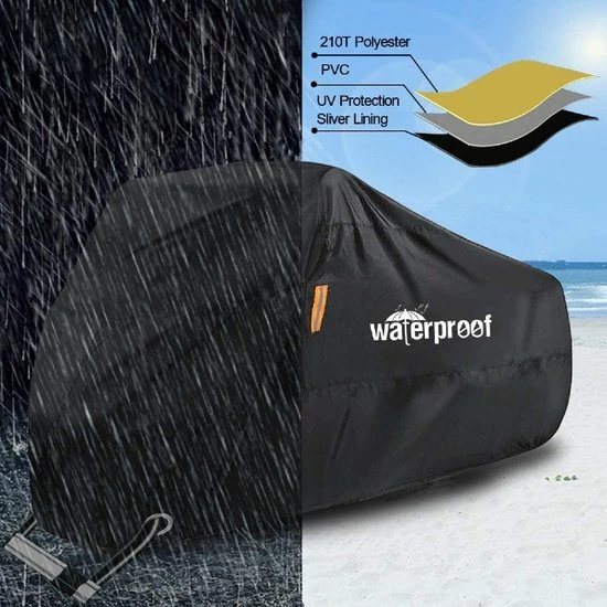 - ?210T hoogwaardig Oxford-weefsel? ? De fietshoes bestaat uit superieur polyester (210T), dat beter waterdicht en uv-bestendig is dan andere materialen. Zilveren coating aan de binnenkant; waterdicht en duurzaam, geschikt voor gebruik buitenshuis. Beschermt de lak van je motorfiets tegen regen, hitte, stof, zon, krassen enz. Vooral voor echte leren stoelen biedt het uitgebreide bescherming.