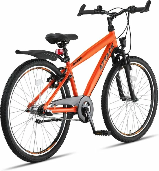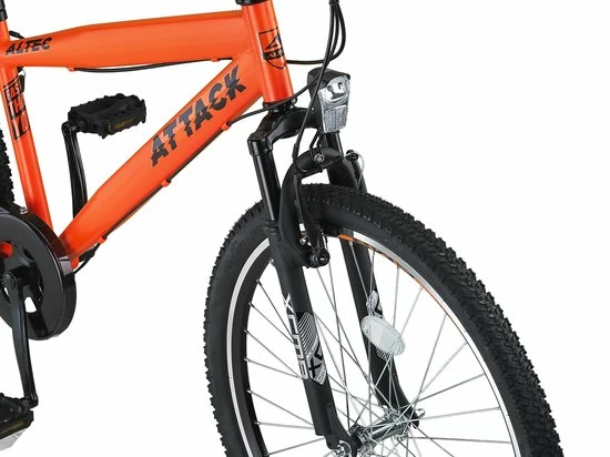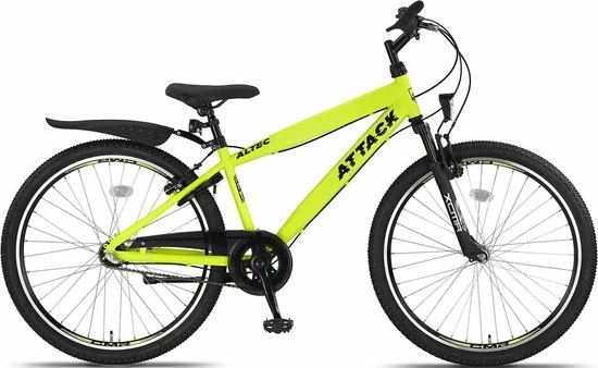Altec Attack Kinderfiets Jongens 26 inch 3vOnze Altec fietsen zijn nog niet afgemonteerd en worden in een doos verstuurd. Zie de handleiding onderaan voor instructies. Altec Attack Kinderfiets Jongens 26 inch 3v De Altec Attack wordt geleverd met voor- en achterspatborden Opvallen doe je zeker met de Altec Attack. Deze multifunctionele jongensfiets kan gebruikt worden voor de dagelijkse ritjes, maar kan ook gebruikt worden om lekker te crossen. De Altec Attack heeft niet alleen een stoer uiterlijk maar ook nog eens hele handige specificaties! Het frame is vervaardigd uit staal. Dit maakt deze stoere mountainbike erg stevig. Ondanks dat deze fiets tegen een stootje kan, wil je dit natuurlijk voorkomen. Daarom beschikt deze stoere mountainbike over veilige V-brake remmen. Deze zitten zowel voor als achter. Geen heuvel is te steil en de langere routes zijn appeltje eitje met de Shimano Nexus 3 versnellingen. Schakel eenvoudig naar een trapzwaarte die voor jou comfortabel voelt. Ga je een middagje crossen? Geen probleem! De luxe vervende voorvork vangt de schokken goed op. De Altec Attack komt met een voor gemonteerd ringslot. Hiermee zet je de fiets eenvoudig op slot. Toch raden wij voor de veiligheid een extra kabel of kettingslot aan. Verende voorvork: Een verende voorvork biedt net dat beetje extra comfort Shimano Nexus 3: Een Shimano Nexus 3 schakelsysteem werkt altijd soepel en nauwkeurig Voordelig: Zeer mooie prijs kwaliteitsverhouding Design: De fiets heeft een stoer en sportief design Verlichting werkt op batterijen