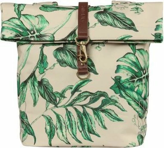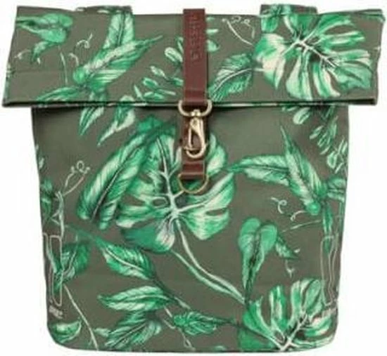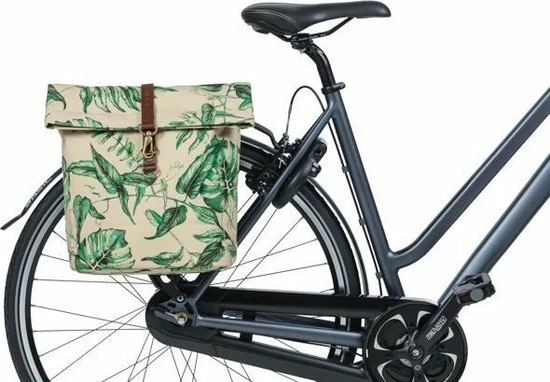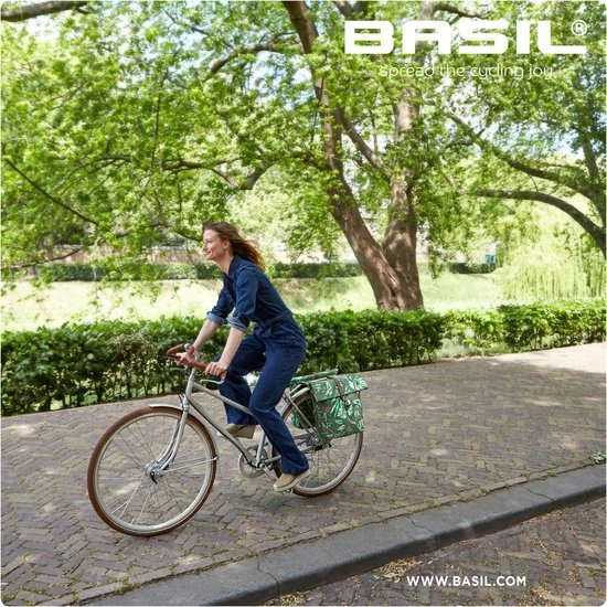 Met de Basil Ever-Green kies je voor een duurzame en bijzondere dubbele fietstas! De trendy botanische print op de tas is handgeschilderd door de getalenteerde Nederlandse illustrator Meggy Lemmens. En wist je dat de tas gemaakt is 40% gerecycled PET plastic? De waterafstotende stof voelt als katoen aan, maar bevat maar liefst 39 gerecyclede plastic flesjes van 350 ml. Daarnaast heeft de tas vegan lederen details en antiek bronzen afwerkingen. Daarmee is de Basil Ever-Green dubbele fietstas echt een statement! De Basil Ever-Green dubbele fietstas heeft een inhoud van 28-32 liter. De waterkerende vouwsluiting is met een musketonhaak te verstellen. Zo kun je dus inhoud van de tas vergroten naar 32 liter. Daarnaast neem je extra spullen mee in het voorvak dat je kunt sluiten met een magneet. Heb je veel en zwaardere spullen in je tas? Dan kun je de tas combineren met de Basil Afstandhouder (apart verkrijgbaar). Deze houder voorkomt dat de tas in de spaken van je fiets komt. Je bevestigt de Basil Ever-Green dubbele tas eenvoudig op je bagagedrager met het Universal Bridge systeem. Dankzij het Universal Bridge systeem kun je kiezen uit hoe je de tas wilt bevestigen. Het bevestigen kan met de voorgemonteerde riempjes. Of in combinatie met het Basil DBS systeem (afneembare bagagedragerplaten) of een adapterplaat zoals MIK. Beide systemen dien je apart aan te schaffen. Eigenschappen: Compacte en toch ruime dubbele fietstas met een inhoud van 28-32 liter. Met het Universal Bridge systeem bevestig je de fietstas gemakkelijk op je bagagedrager. Alle zijden van de tas zijn voorzien van reflectie. Dat maakt je beter zichtbaar. Gemaakt van duurzame materialen. Bijzondere handgeschilderde botanische print.