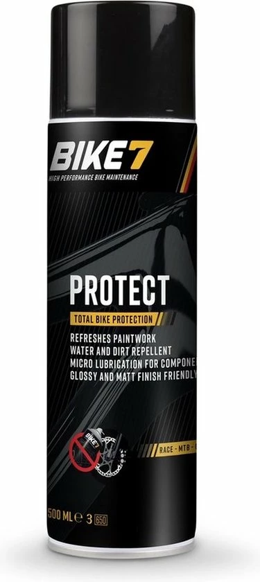 als je fiets helemaal gereinigd is, wil je dat hij schoon blijft. Een nabehandeling met bike7 protect and shine zorgt voor een verzorgende flinterdunne film over je hele fiets. Deze waterafstotende toplaag werkt tegelijkertijd smerend en beschermend en is de ideale finishing touch na elk onderhoud.