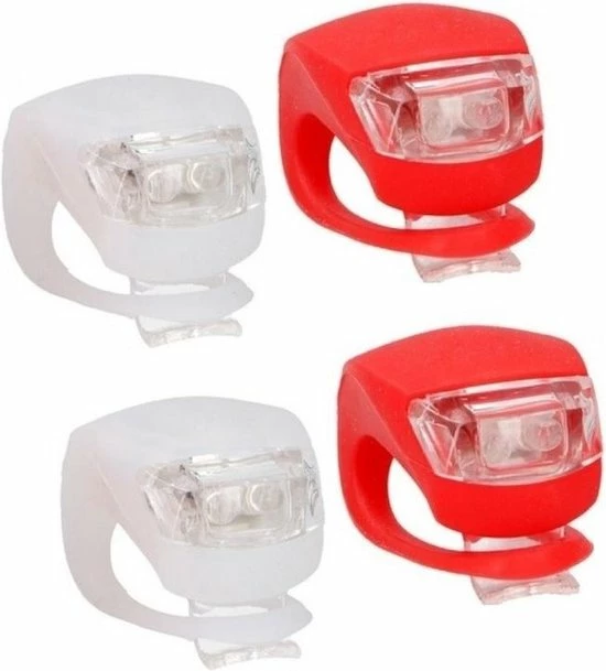 2x LED fietsverlichting set. U ontvangt 2x een siliconen voorlicht en 2x een siliconen achterlicht, welke dankzij de elastische band gemakkelijk aan uw fiets te bevestigen zijn. De fietslampjes werken op CR2032 batterijen welke mee worden geleverd. Afmetingen: 3 x 4 x 1 cm.