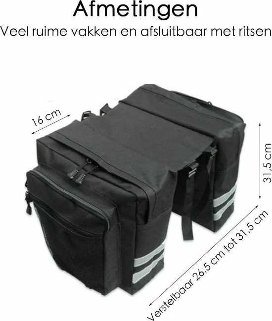 De Dubbele Fietstas bestaat uit twee ruime fietstassen van 31,5 cm bij 16 cm. Genoeg ruimte dus voor een laptoptas, boodschappen of praktische zaken zoals een kleine fietspomp voor onderweg. Ook hebben beide tassen nog een kleiner vak, zo hou je ze lekker opgeruimd!