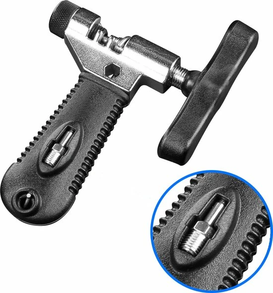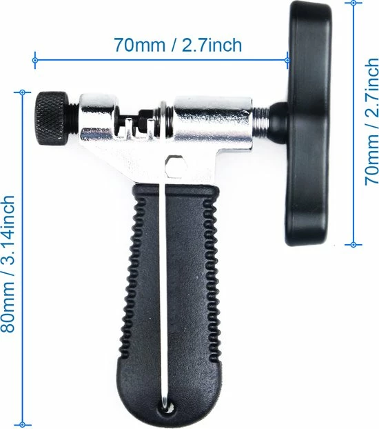 - Hoge kwaliteit materiaal: Gemaakt van hoogwaardig roestvrij staal dat super sterk is en niet zal buigen. Het metalen frame heeft een comfortabele rubberen anti-slip grip. Wordt ook geleverd met een extra roestvrijstalen verwijderpunt en een roestvrijstalen kettinghaak die de spanning op de ketting houdt, zodat werkzaamheden aan de kettingschakels veilig kunnen worden uitgevoerd zonder de ketting van de fiets te halen.