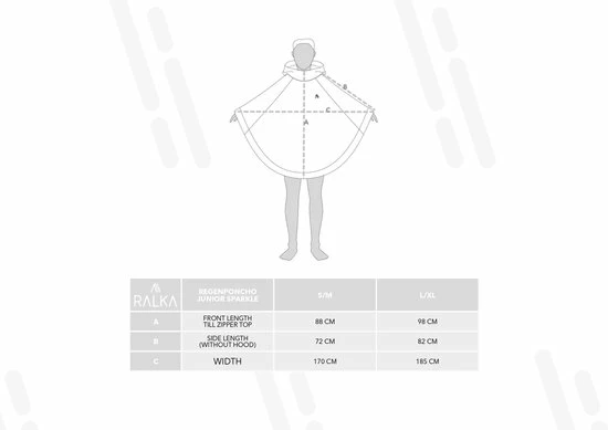 Trendy poncho, dus zie er goed ?n krijg nooit meer een nat pak! Je blijft lekker droog met de Ralka Sizzle Regenponcho. Trotseer gemakkelijk elke regenbui tijdens het fietsen, wandelen met de hond of tijdens allerlei soorten buitenactiviteitenl. Je trekt deze hippe unisex poncho snel en makkelijk aan over je eigen kleding waardoor je in een mum van tijd beschermd bent tegen wind en regen. De extra waterbestendige poncho heeft een grote capuchon en valt ruim, waardoor je vrij kunt bewegen. Dankzij het 4000mm waterdichte PU materiaal en de gelaste naden kun je er zeker van zijn dat deze luxe poncho geen water doorlaat. Door de polyester voering voelt de poncho zacht en comfortabel aan. De regenponcho heeft drukknopen aan de zijkant, om mouwen van te maken. Op deze manier blijft de poncho goed zitten en sluit deze goed aan om de armen. Daarnaast heeft de poncho handige zakken met overslag waar je bijvoorbeeld je sleutels of telefoon waterdicht in kunt bewaren. Tenslotte heeft de poncho een waterbestendige rits en kun je hem ook gebruiken als fietsponcho door de extra anti-opwaailussen aan de binnenkant. Je kunt de cape gemakkelijk opbergen en overal mee naartoe nemen.