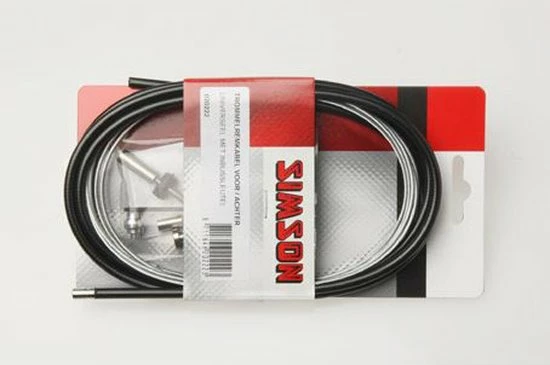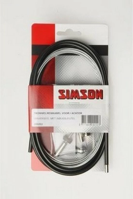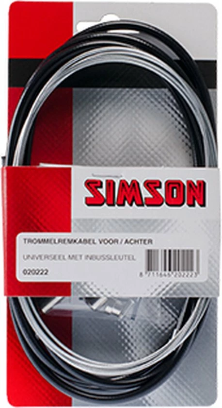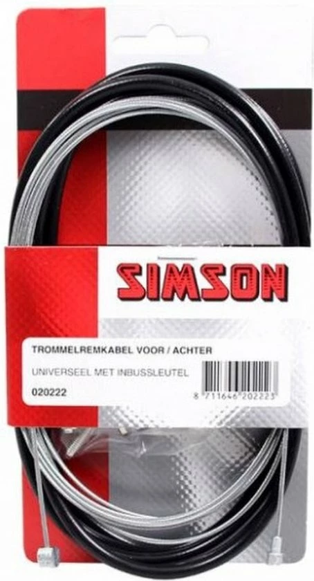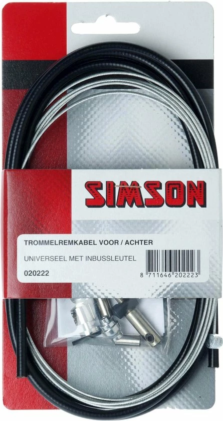 De Simson Trommelremkabelset universeel zwart is een complete trommelremkabelset. De set bestaat uit een zwarte buitenkabel en een roestvrijstalen binnenkabel van 2,25 meter met universele ton- en peernippel. De set wordt geleverd inclusief inbussleutel en bevestigingsmateriaal. Knip de nippel die niet van toepassing is af. Steek de binnenkabel door de buitenkabel en sluit de binnenkabel aan op de rem. Stel de rem af en knip de binnenkabel ? 2 cm voorbij de schroefnippel af. Omdat de remkabelset universeel is, kunnen er onderdelen overblijven. Productspecificaties: Universeel met inbussleutel, zwart 2,25 meter met ton- en peernippel Gegalvaniseerde kabel