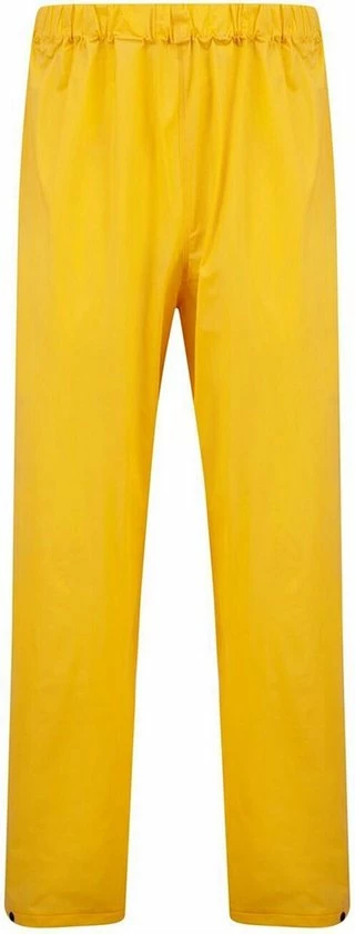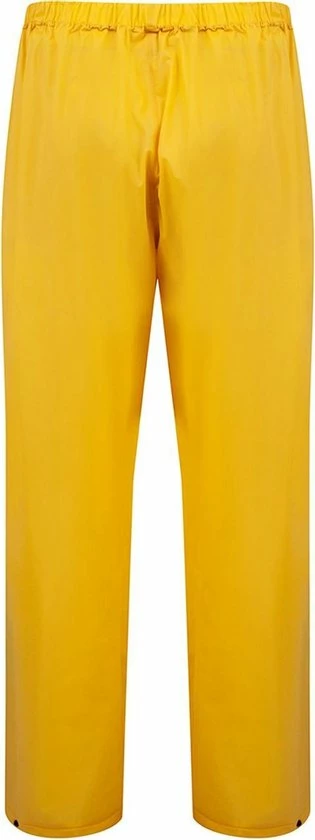 PVC regenbroek. Losse pasvorm met elastische tailleband. Zakopening. Studs op zoom om beenopening aan te passen.