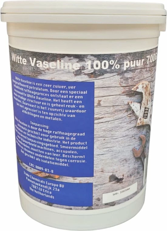 Een zeer zuiver, ver doorgeraffineerd petrolatum. Volkomen witte kleur. Geheel reuk- en smaakloos. Absoluut zuurvrij, waardoor het niet agressief is ten opzichte van afdichtingen en metalen. Bestand tegen inwerking van chemicali?n.