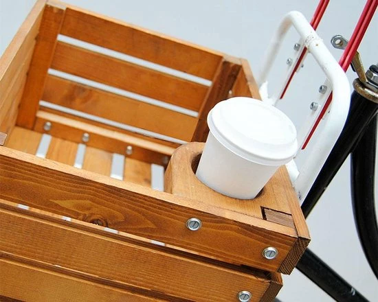 The Transporter is h?t houten fietskrat voor elke fietser die van functionaliteit, duurzaamheid en design houdt. Handgemaakt van FSC-gecertificeerd vurenhout in groot formaat en robuust ontwerp. Duurzaam bovendien, want gebeitst voor de ultieme bescherming tegen het weer. En die cappuccino? Die kun je dankzij de handige bekerhouder in het krat gewoon onderweg opdrinken.