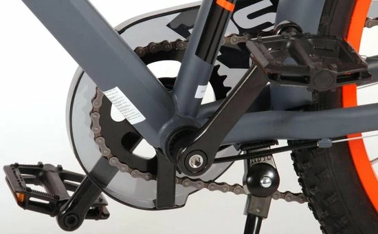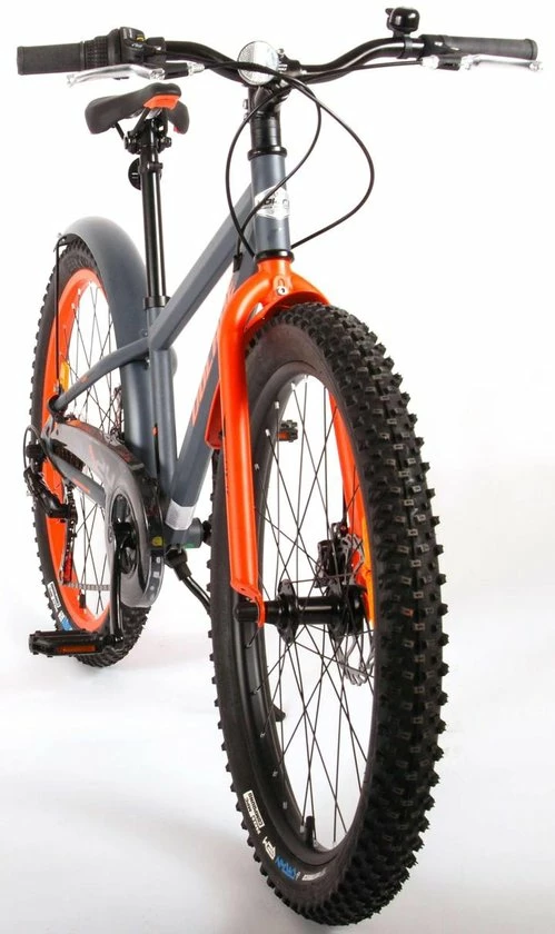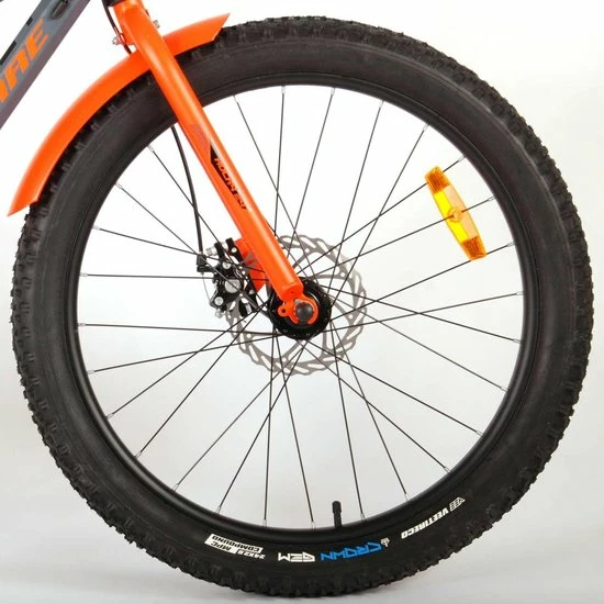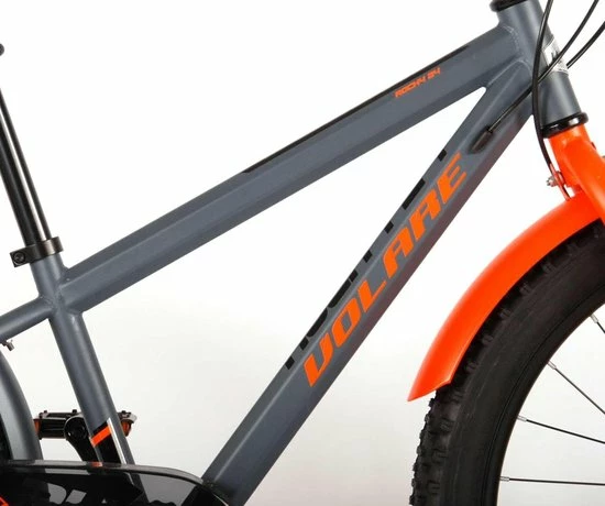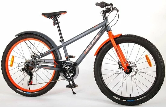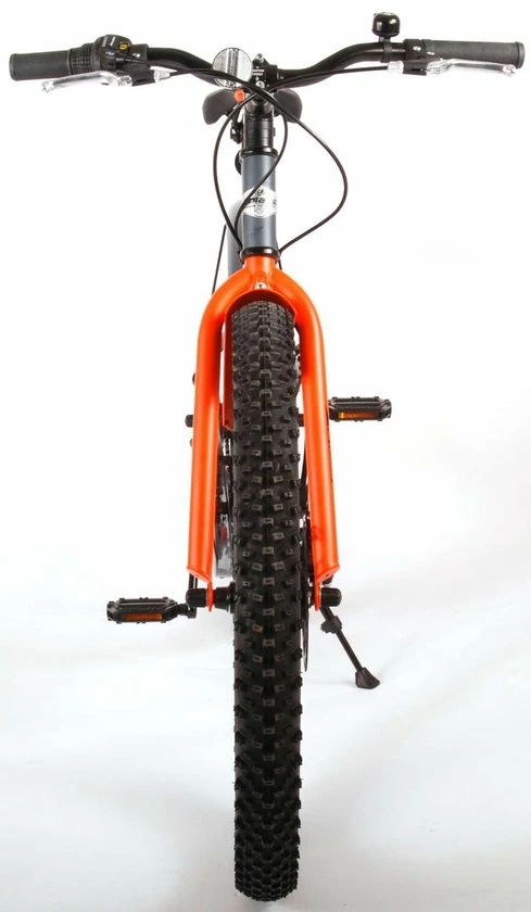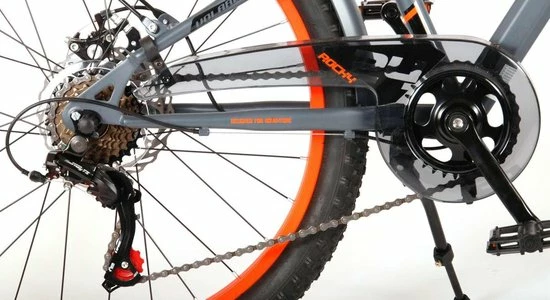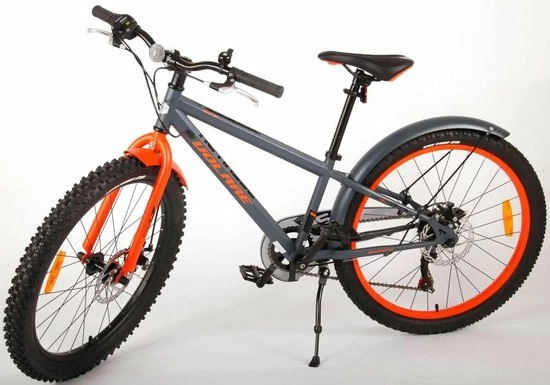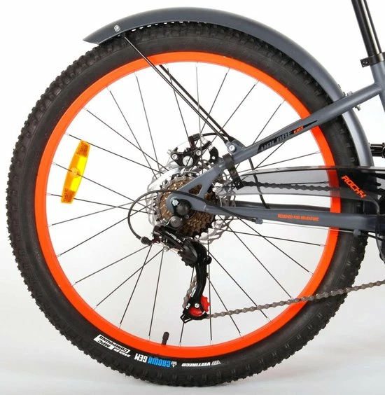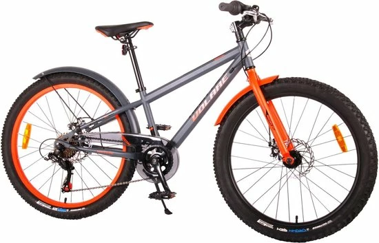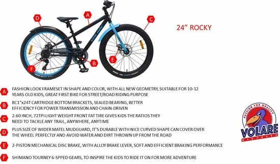 Volare Rocky 24 inch kinderfiets 85% afgemonteerd. De Volare Rocky kinderfietsrange is van superieure kwaliteit. De Rocky fiets heeft een Shimano Tourney 6 Speed versnelling, aluminium velgen, een aluminium stuurpen, betere kwaliteit trappers, zwarte spaken en een luxe super zacht zadel. De 24 inch Rocky is een stoere jongensfiets met extra brede “Fat” banden, waarbij de voorband dikker (2.60) is als de achterband (2.25), waar ieder kinderhart sneller van gaat kloppen. Ook de spatborden zijn extra groot en mooi gevormd waardoor zij al het opspattende vuil tegenhouden. Om vaart te kunnen minderen heeft de fiets een veilig remsysteem met 2 x mechanische Disc Brakes (dus geen terugtraprem). De zadelbuis is extra laag met een extra lange zadelpen, waardoor de fiets met uw kind mee kan groeien. Daarnaast heeft de fiets een aluminium smart conrtol systeem, dat ervoor zorgt dat het stuur begrensd is (niet in hoogte verstelbaar). De handvatten zijn gemaakt van Kraton, een zacht rubber, waardoor de handvatten heerlijk in de hand liggen. De fiets heeft een sportief pistoltype kettingkast, stevige aluminium standaard en een fietsbel. Het geometrische frame in sportieve stoere kleurstelling met watertransfer stickers maakt van deze fiets een echte eyecatcher. Deze fiets is d? fiets om kinderen te inspireren om de wereld te gaan ontdekken.