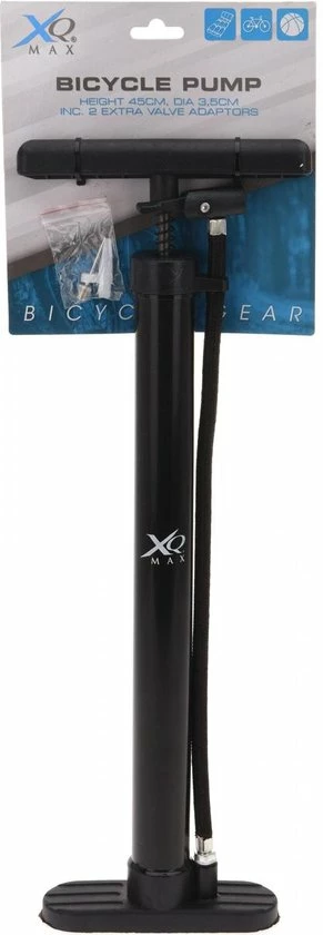 XQ Max fietspomp van polypropyleen met een lengte van 45 cm. Voorzien van 2 extra ventielen om naast de fietsband ook een luchtbed of bal op te pompen.